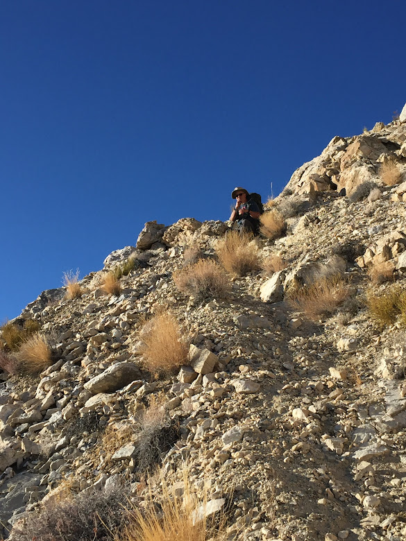 Briefly descend to loop around the right of a peak and continue ascending on this trail until you reach the start of the traverse. Once you turn the corner you will lose sight of Death Valley and be able to spot plant growth upstream from Beveridge.”