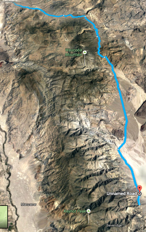 The location of the ghost town, Beveridge CA, lies between the Inyo Wilderness area and Death Valley. It’s situated in a valley about 5,000 feet in elevation, where a spring supplies water down the gulch. Getting into the town means about 6,900 feet of vertical ascent, followed by 1,300 feet of descent into Beveridge Valley. Fortunately for us, several people have blogged about their trips into the town, but with multiple options in, we chose the path outlined by Matt Clapp in his blog, as it seemed the most straightforward and achievable route in.
