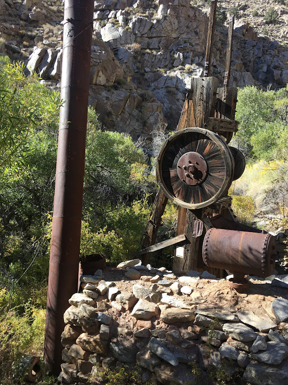 The descent into Beveridge was fairly unremarkable, except for the rattlesnake encountered by Robert. We rounded a few more “fingers” of the mountain on the last of the traverse, and headed down. We had already seen a couple of interesting remaining artifacts from the mining era along our trek in quite random places, but it was fantastic to not only begin to see the valley in earnest, but the first item we knew was directly associated with the town, the “tram”. I have no idea how it worked, but the cables stretch several thousand feet, and at one point there was a pulley still attached to the cabling. We descended the last part of the trail, after taking a few required pictures at the tram, and finally made it to our destination!