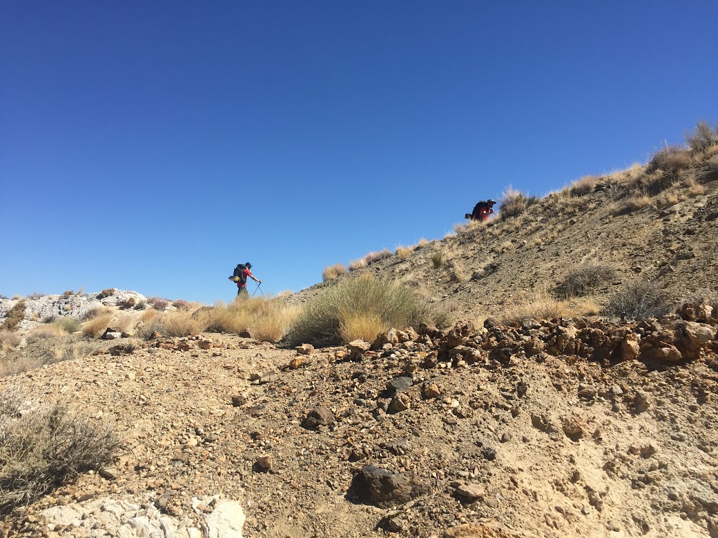 Briefly descend to loop around the right of a peak and continue ascending on this trail until you reach the start of the traverse. Once you turn the corner you will lose sight of Death Valley and be able to spot plant growth upstream from Beveridge.”